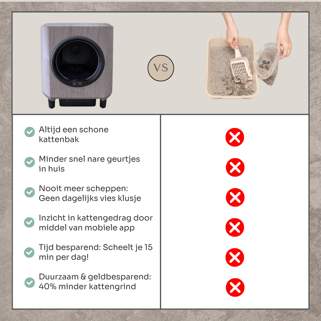 Katten zijn van nature schone dieren. Hoe goed we ons best ook doen: Bij een traditionele kattenbak kunnen we onmogelijk reinigen na élk kattenbakbezoek. Een vieze bak kan ervoor zorgen dat je kat stress ervaart of een andere plek gaat zoeken voor z'n behoefte. Een schone kattenbak draagt bij aan het welzijn van je kat.