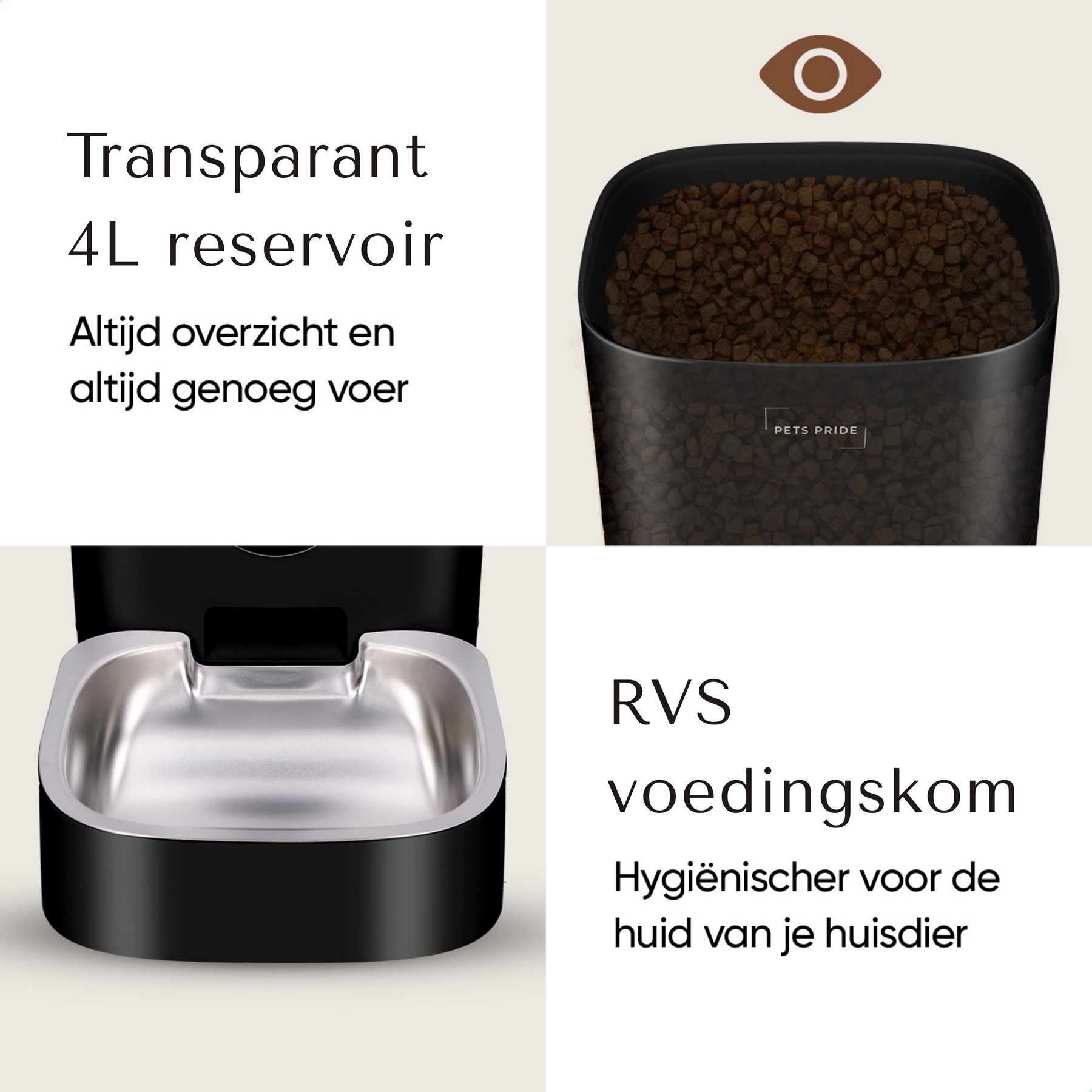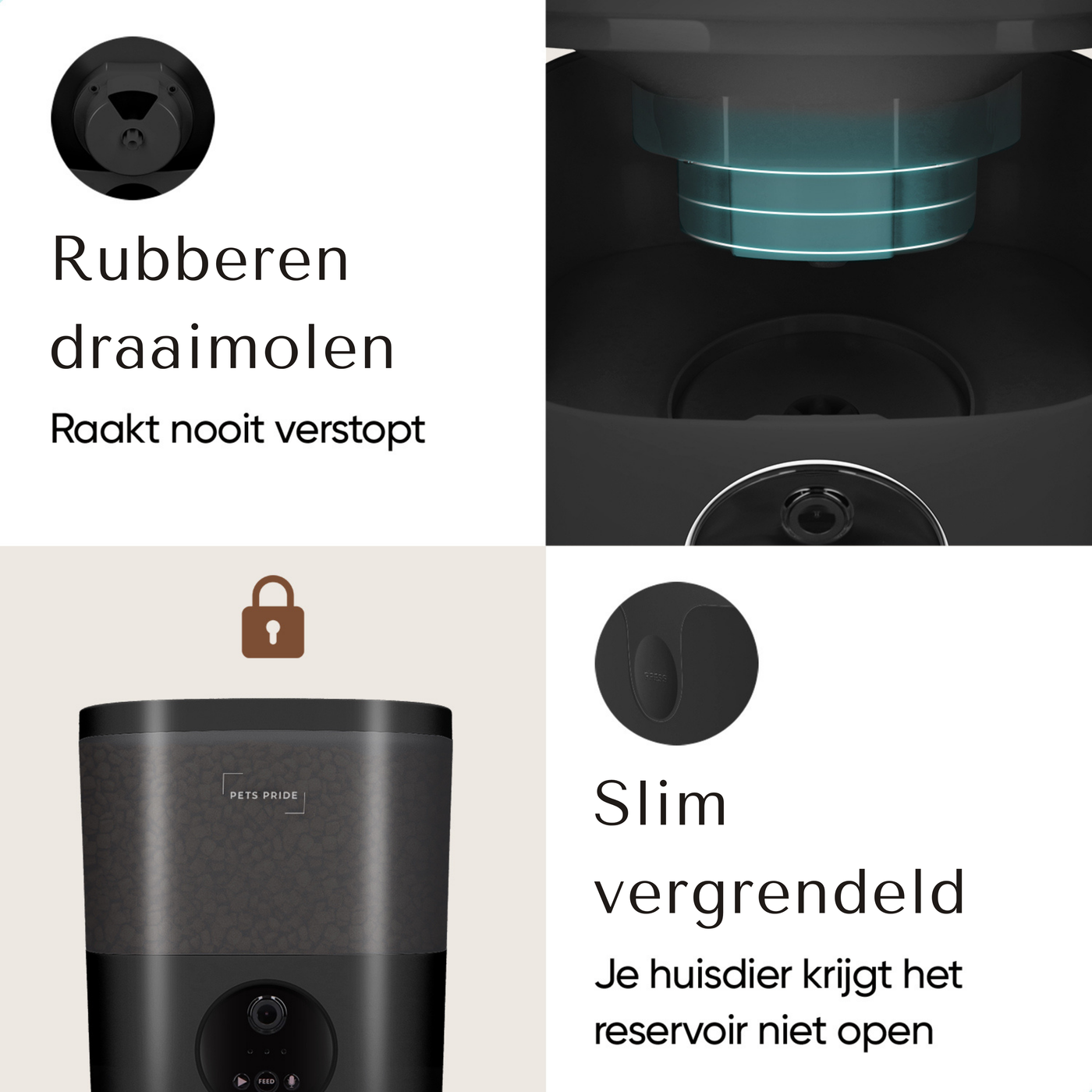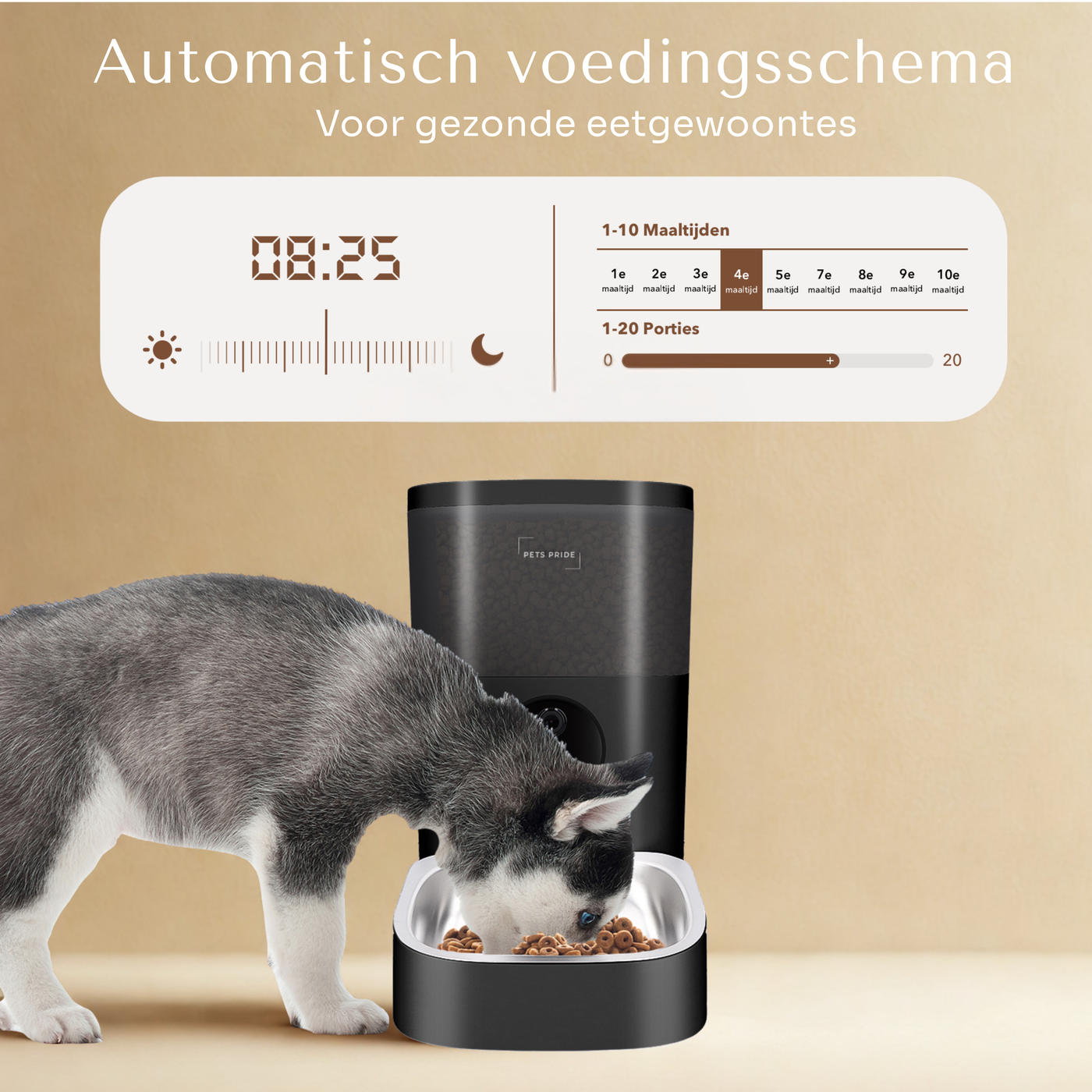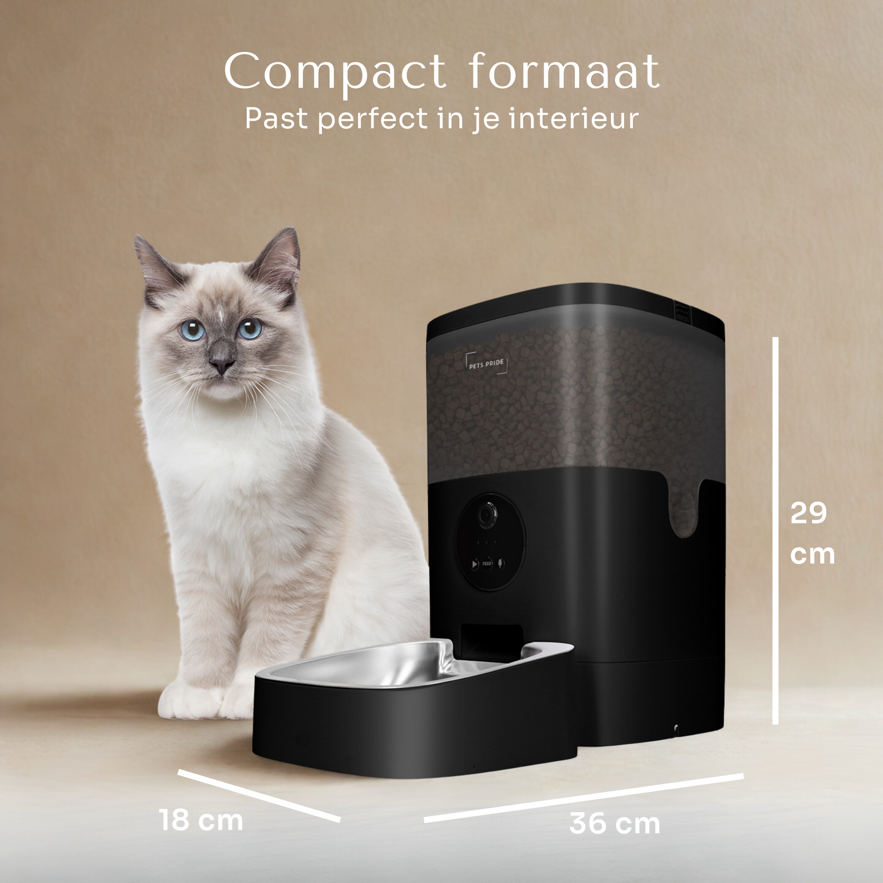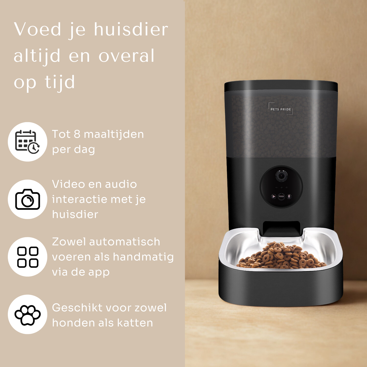 Met de Pets Pride automatische voerbak hoef jij je geen zorgen meer te maken of je kat of hond op tijd voorzien wordt van eten! Ideaal voor als je (onverwacht) niet op tijd thuis kan zijn. Dankzij de premium kwaliteit, de automatische voedingsschema’s en de smart app control via je telefoon kun je er altijd zeker van zijn dat jouw huisdier in goede handen is. Zo kan je 20 porties per maaltijd en 1 tot 8 maaltijden per dag instellen. Elk portie bevat 7 tot 9 gram per portie brokjes. Door de ingebouwde 1080 Full HD camera en microfoon in de voerautomaat hoeft jouw huisdier je niet te missen en kun je altijd even meekijken, praten en meeluisteren. Ga met een gerust hart van huis met deze Pets Pride automatische voederbak!