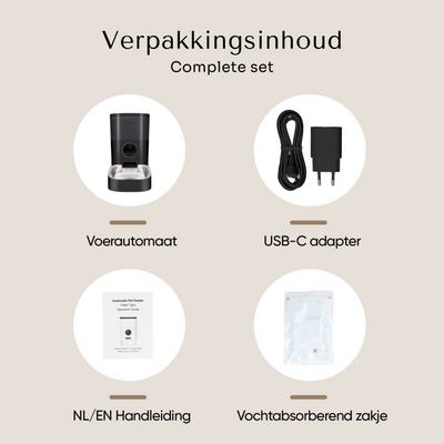 ✓ Inhoud verpakking: Automatische voerbak, RVS voerbak, adapter, vochtabsorberend zakje